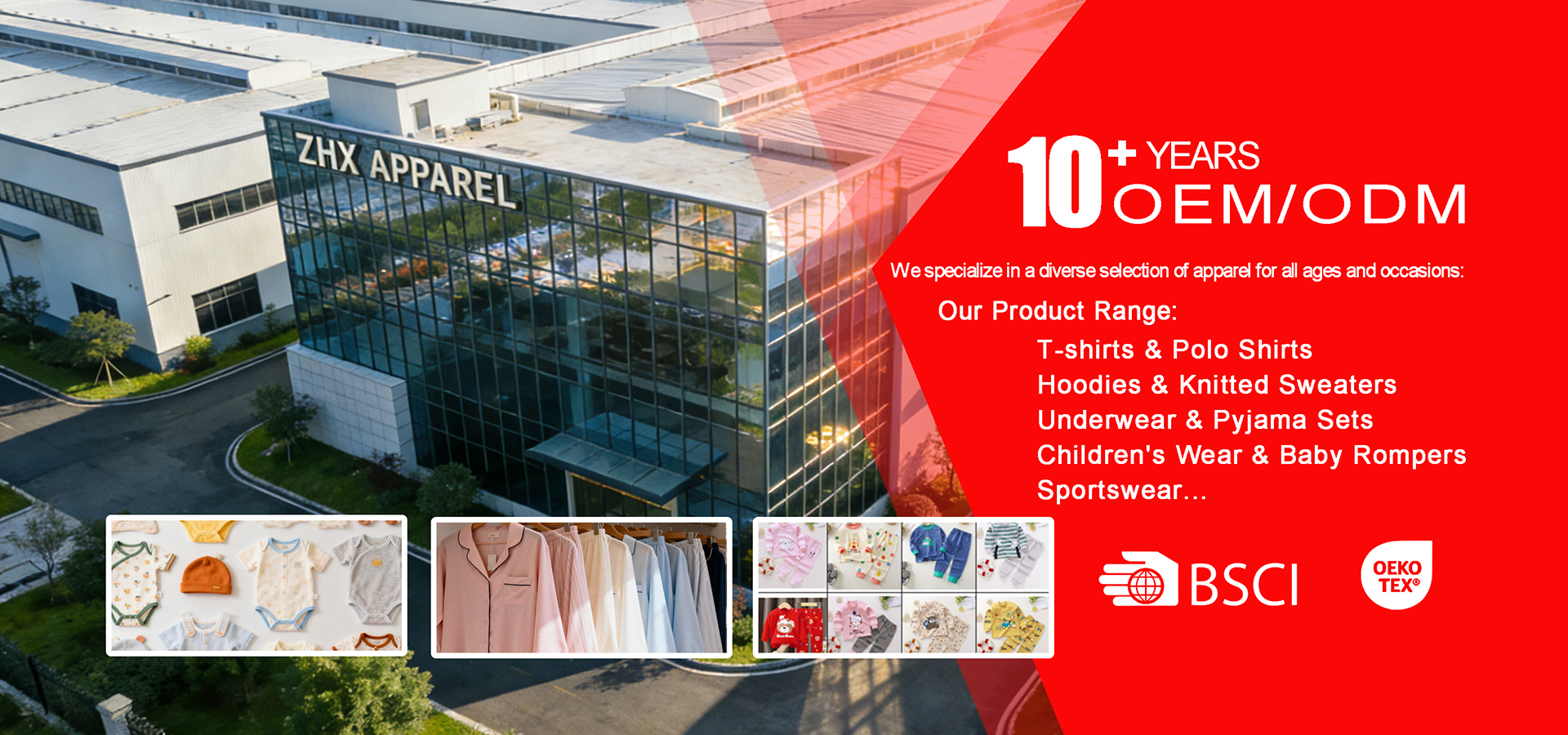 We are ZHX Apparel, a professional apparel manufacturer based in Qingdao, Shandong,with10+ years of OEM/ODM experience.We specialize in baby rompers, children' s wear,women's loungewear, underwear, and more, holding BSCl and OEKO-TEXX certifications for compliance with global standards.